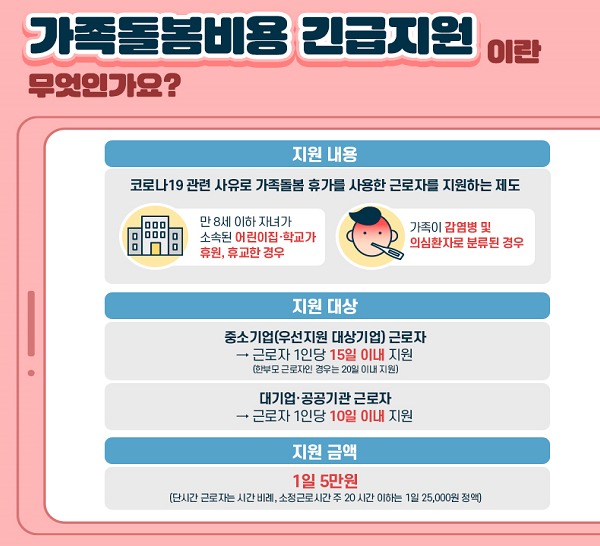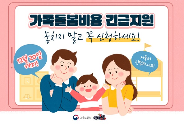 가족돌봄비용 긴급지원은 코로나19 상황에서 무급의 가족돌봄휴가를 사용한 근로자를 지원하기 위해 한시 운영 중인 제도로 연말에는 사업이 종료될 예정이다.