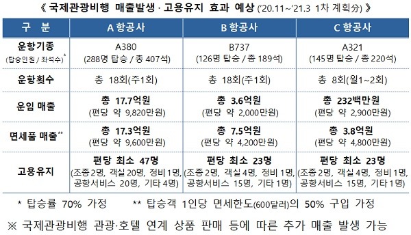 정부는 이번 ‘무착륙 국제관광비행 추진 계획’을 통해 코로나19 이후 운항 중단으로 인해 자격상실 위기에 처한 조종사 등 항공(운항·지상정비·기내식 등) 및 면세업계의 고용유지를 지원하고 항공사의 경우 운임으로만 총 48억 1000만 원(편당 2000만~9820만원)의 수익을 예상(6개사 2020년 12월 ~ 2021년 3월 1차계획분)하며 이외 면세·관광업계 수익창출이 가능할 것으로 기대하고 있다.