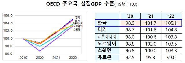 2022년에도 회원국의 1/3 이상(37개국 중 17개국)이 위기 이전 GDP 수준에 미달하나 한국의 경우 회원국 중 GDP가 코로나19 위기 이전인 2019년 수준을 가장 큰 폭으로 상회했다.