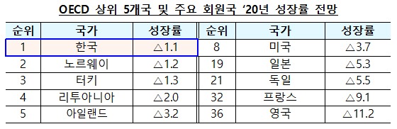 하지만 OECD는 “한국은 효과적인 방역조치로 인해 회원국 중 올해 GDP 위축이 가장 작은 국가”라고 명시적으로 언급했다.